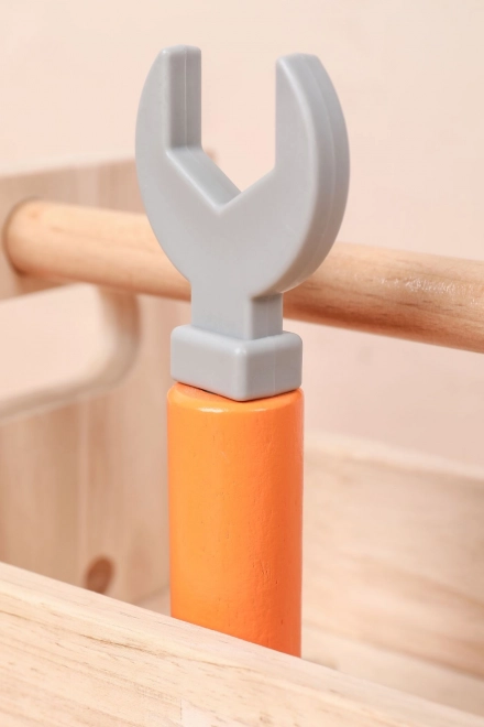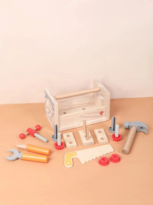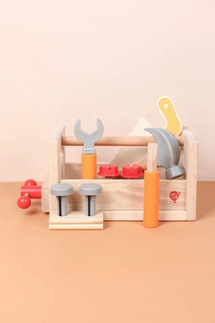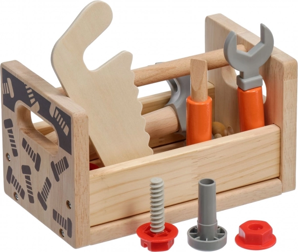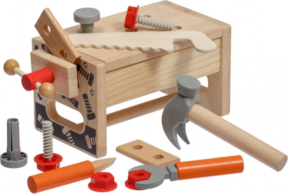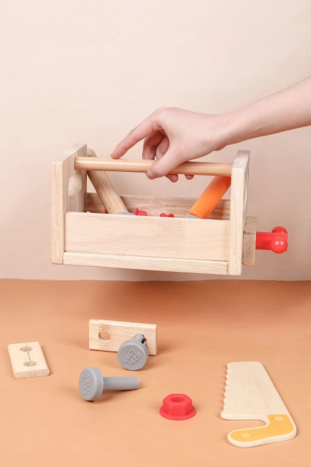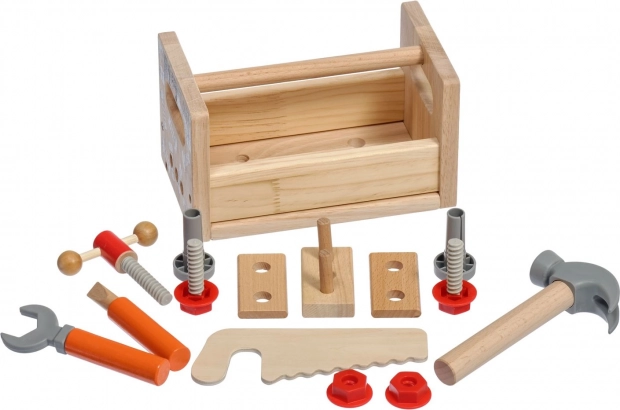 Martello, seghetto, cacciavite, chiave, viti, dadi, morsetto e pezzi in legno con fori: tutto per un gioco realistico e di apprendimento.