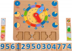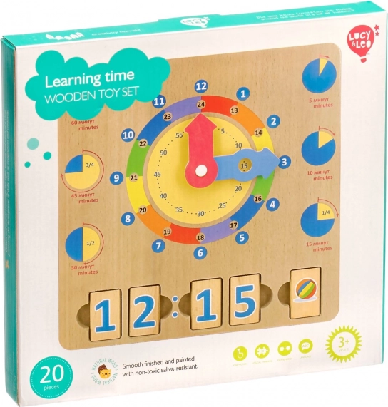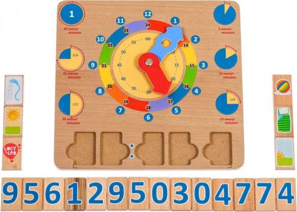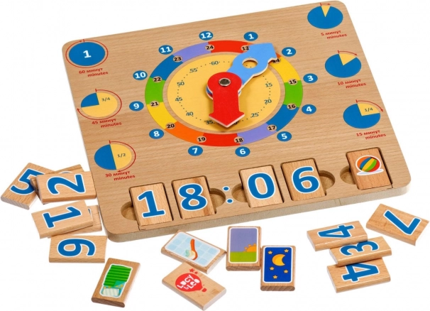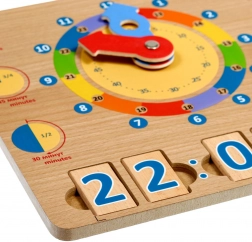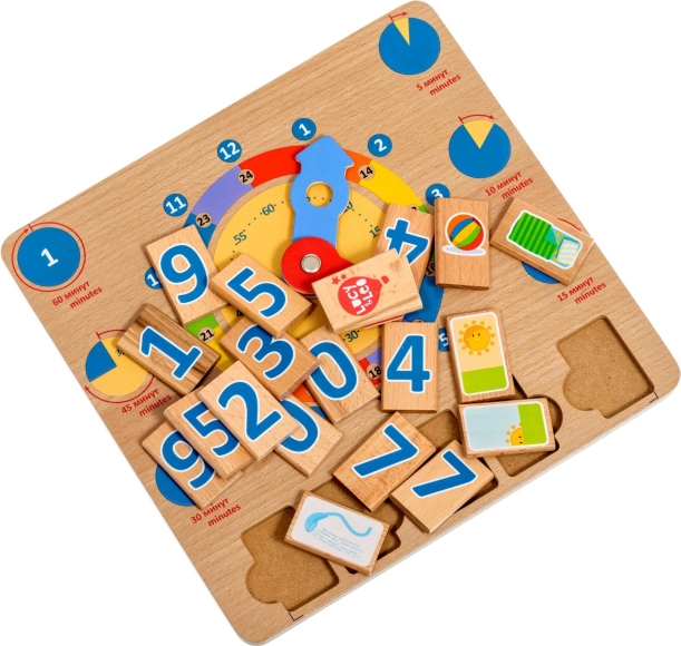 Il set comprende 14 blocchi numerici e 6 blocchi con immagini di attività giornaliere. Quattro blocchi del tempo possono essere inseriti nelle apposite fessure per creare l’orario digitale, mentre il quinto blocco rappresenta l’attività corrispondente. In questo modo i bambini collegano visivamente l’orologio analogico alla notazione digitale e alla routine quotidiana.