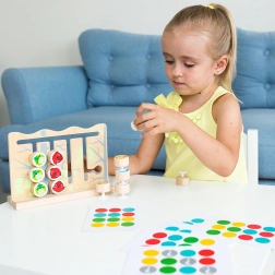 Include 6 carte fronte-retro con motivi colorati. I bambini posizionano i pioli nelle posizioni corrette seguendo i modelli e sviluppano il ragionamento logico.