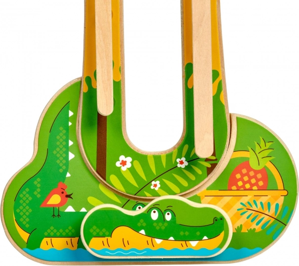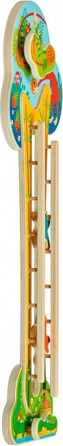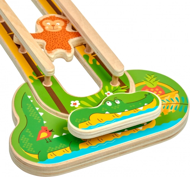 Scoprite un giocattolo intelligente e coinvolgente con un fresco tema giungla che intrattiene i bambini per lunghi minuti. Una volta appeso alla parete, fa risparmiare spazio nella cameretta e crea una zona di gioco attraente. Due scimmiette in legno scendono lungo una doppia pista, fanno capriole e ruotano, così ogni discesa è divertente e diversa.