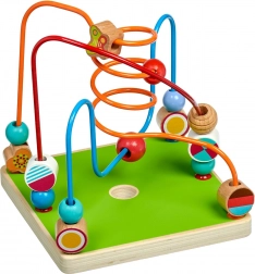 Le perline colorate su fili curvi aiutano a sviluppare coordinazione e pazienza. Spostando le perline i bambini allenano la presa e la concentrazione.