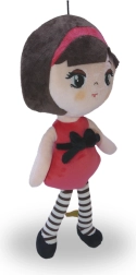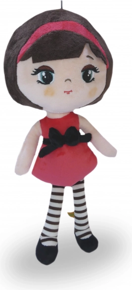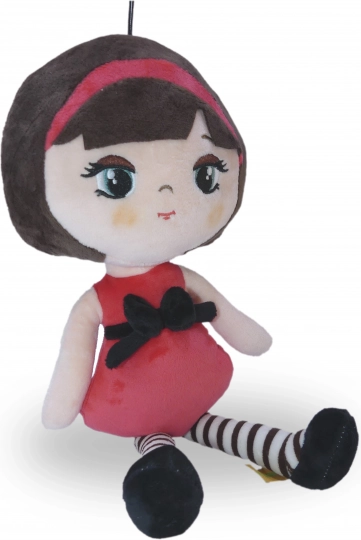 La bambola è vestita con un abito rosso e un fiocco nero che attira l'attenzione.