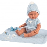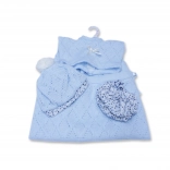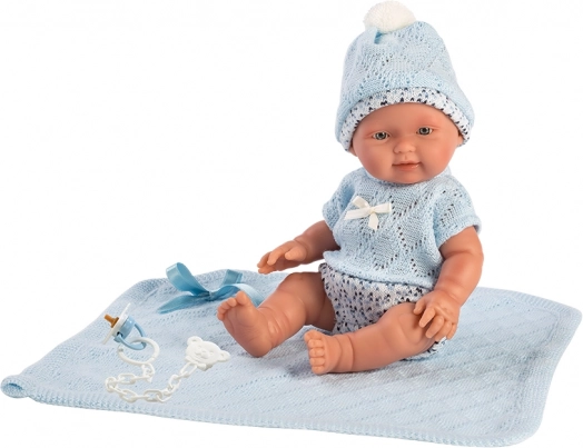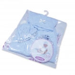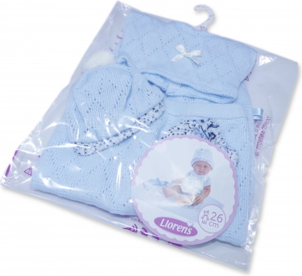 Il vestitino per bambola neonato di dimensioni 26 cm include un maglioncino, un cappellino e dei pantaloni. È progettato per offrire il massimo comfort ed eleganza al gioco con la bambola. Il set include anche una morbida copertina lavorata a maglia che completa il look complessivo. Questo set è confezionato in un imballaggio trasparente con un appendiabiti in plastica o cartone.
