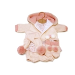 Tutto per un outfit perfetto: cardigan con cappuccio, tutina/abito floreale, scaldacollo con pon pon, calzini, guantini ed elastici per capelli per un look coordinato della bambola.