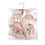 Elegante set 5 pezzi per bambola da 42 cm con tutto il necessario per cambi d'abito perfetti. Include un morbido cardigan lavorato a maglia con cappuccio, una tutina/vestitino a fiori, calzini e guantini, una scalda-collo peloso con pon pon e elastici per i capelli. Finiture di qualità, prodotto in Spagna, ideale per il gioco creativo e lo sviluppo della motricità fine.