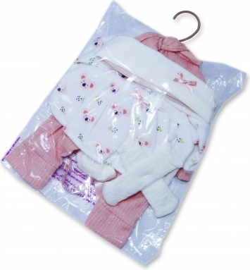 Il set a quattro pezzi include cuffietta, abitino, pantaloni e calzini in colori coordinati, così la bambola sarà sempre ben abbinata e al caldo.