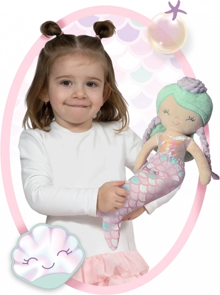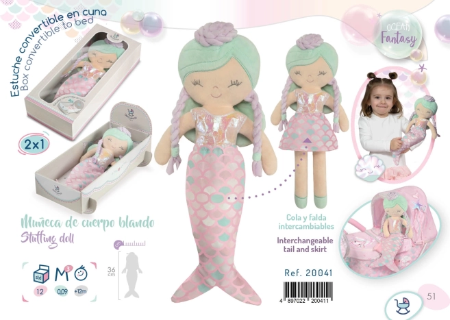 Scopri il magico mondo con la bambola di peluche Ocean Fantasy, che grazie al rivestimento tessile rimovibile si trasforma da una piccola sirena a una bambina. La bambola è realizzata in peluche lucido di alta qualità e si adatta perfettamente alle braccia grazie alle sue dimensioni di 36 cm.
