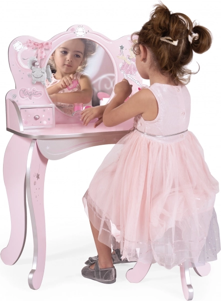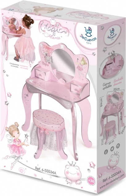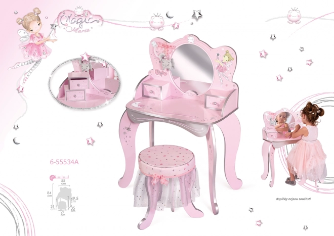 Questo tavolino da toletta in legno è ispirato alle fiabe ed è un complemento ideale per ogni cameretta da bambina. È decorato con bellissime stampe e include