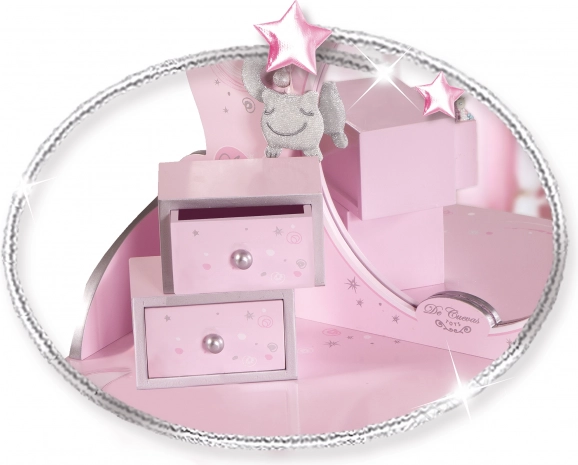Offre due cassetti per conservare accessori e uno specchio che facilita il gioco di vestirsi.
