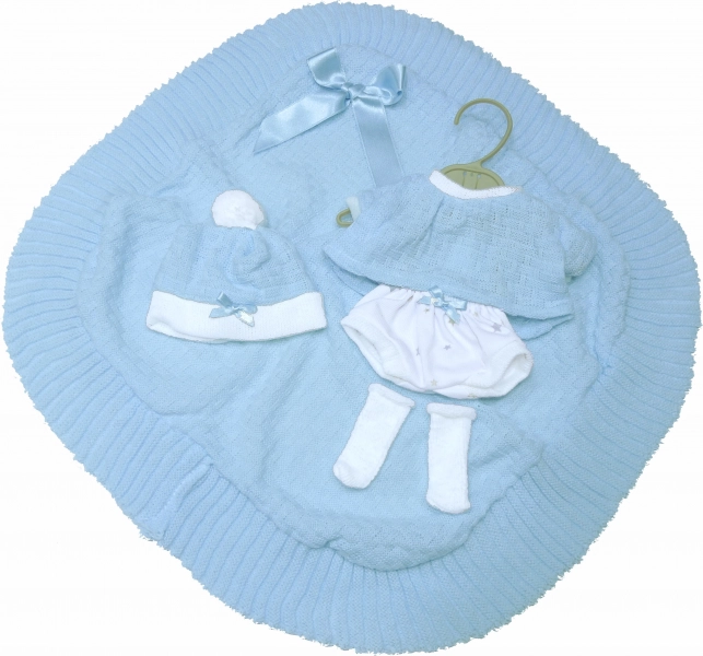 Elegante abito composto da 4 pezzi per bambola neonata New Born di taglia 35-36 cm, include una coperta decorativa con fiocco. Set perfetto per giocare e stilizzare la tua bambola.