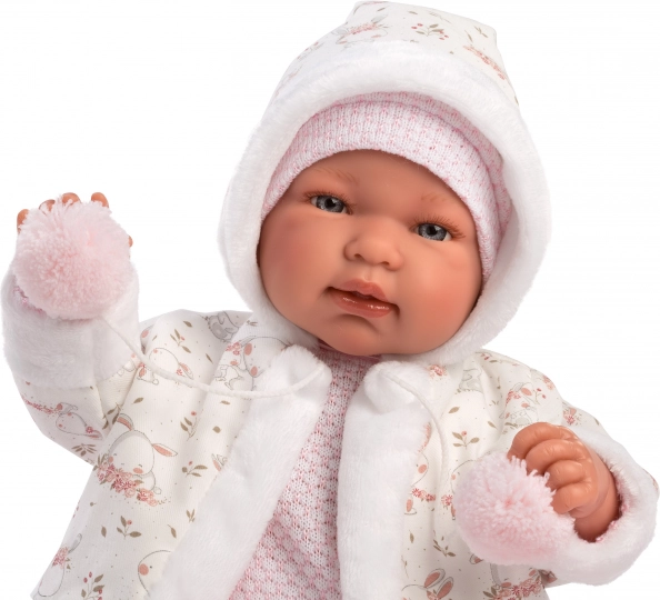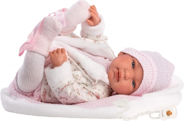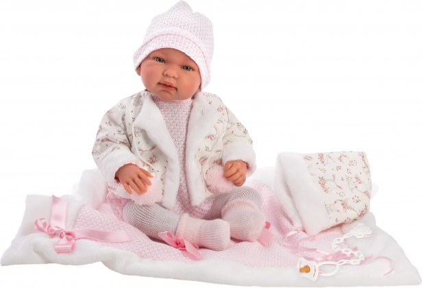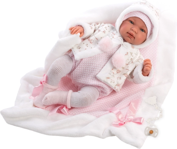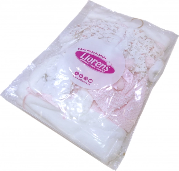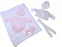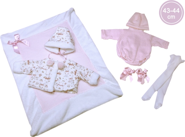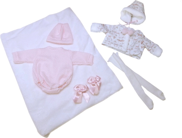 Adorabile vestito a 6 pezzi con coperta in pile decorativa double-face con fiocco per la bambola neonato Llorens della collezione New Born, adatta per bambole di dimensioni 43-44 cm.
