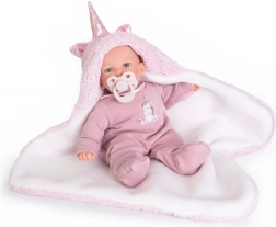 La bambola parlante spagnola del marchio Antonio Juan entusiasma con suoni realistici – premendo il pancino dice “mamma”, “papà” ed emette la risata del bebè. Ha un corpo morbido in tessuto, testa e arti in vinile ammorbidito, misura 27 cm, è confezionata in una scatola regalo ed è adatta ai bambini da 3 anni. Nella confezione sono incluse 3× LR44.