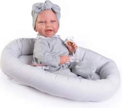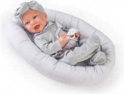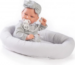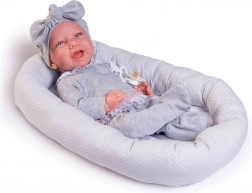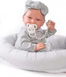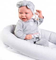 Il set comprende un succhietto con catenella, abbigliamento coordinato con fascia e un morbido nido in tessuto per un riposo confortevole. Il produttore pone attenzione alla sostenibilità: alcuni capi utilizzano cotone biologico non trattato chimicamente. La bambola è confezionata in una scatola regalo, pronta a fare felici fin dal primo istante.