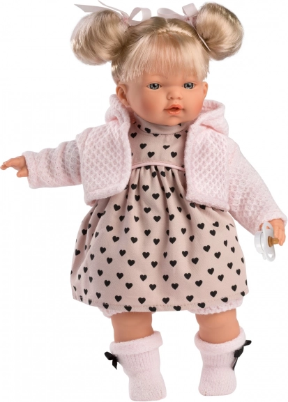 La bambola Llorens Roberta da 33 cm è il compagno ideale per il gioco e lo sviluppo della fantasia dei bambini. Dopo aver rimosso il ciuccio magnetico dice “mamma”, “papà” ed emette un realistico suono di pianto, che può essere facilmente calmato riapplicando il ciuccio. Il corpo morbido in tessuto è perfetto per le coccole, mentre testa e arti in vinile morbido risultano naturali e piacevoli al tatto.