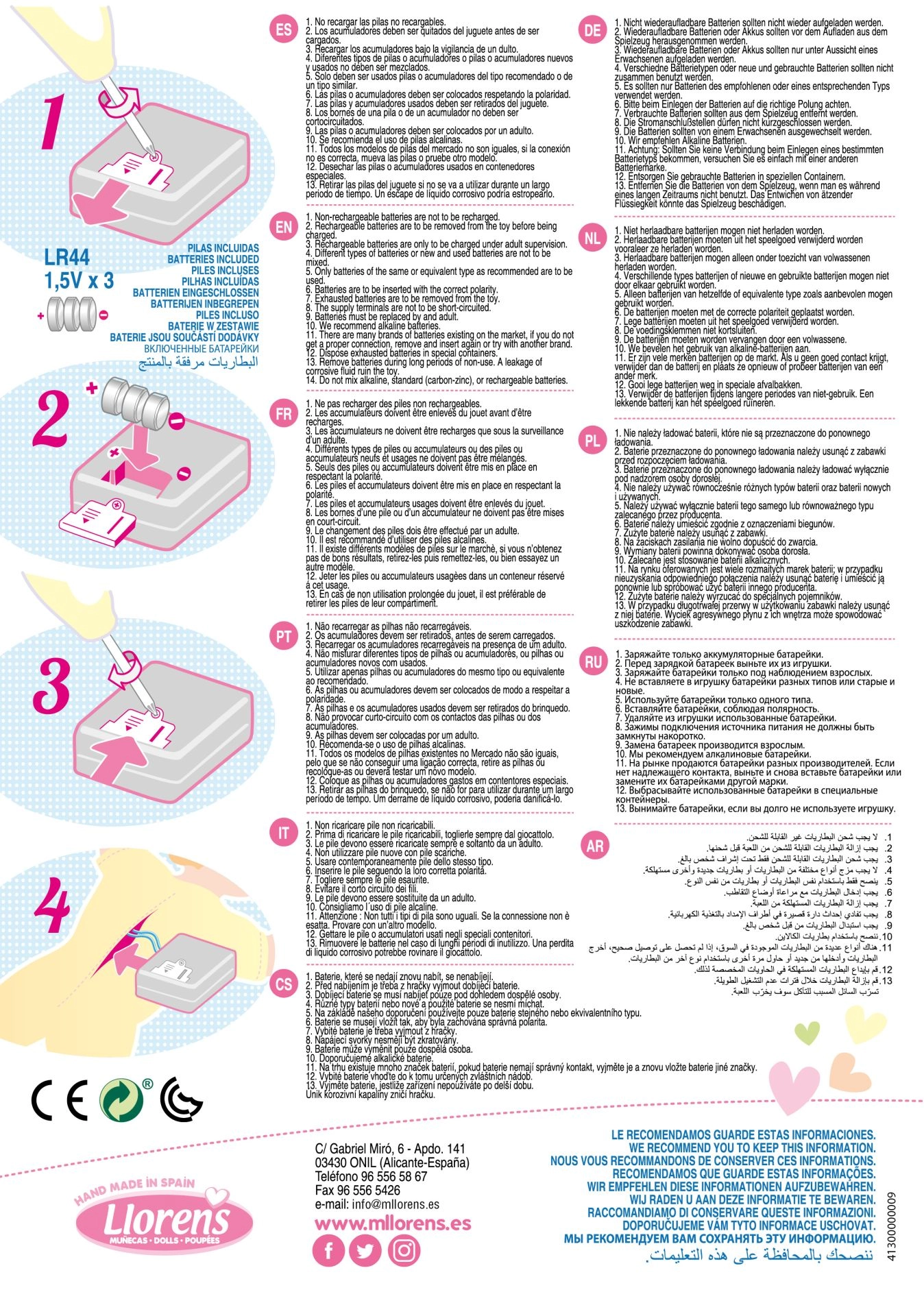 La bambola è realizzata a mano in Spagna con attenzione alla qualità e ai dettagli. È confezionata in un’elegante scatola regalo, perfetta come presente. Per la bambola è possibile acquistare abiti originali della linea Llorens per la misura 33 cm. Le batterie sono incluse nella confezione, quindi la bambola è pronta a giocare subito dopo la rimozione della linguetta di sicurezza.