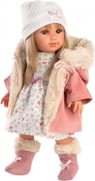 Con attenzione ai dettagli e alla qualità, la bambola Elena è vestita con un cappotto rosa con colletto in pelliccia e un vestito bianco con motivo floreale.