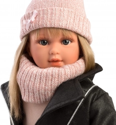 Carla indossa una combinazione moderna: giubbottino biker nero in ecopelle, gonna scura con stampa di volpi, berretto rosa con pompon lavorato a maglia, scaldacollo, calzini e scarpine. Non manca una piccola borsetta lavorata a maglia. Grazie alle norme di sicurezza UE, il gioco con la bambola è assolutamente sicuro. Fornita in una scatola regalo decorativa, ideale come dono.