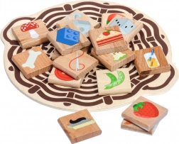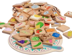 • 56 tessere in legno con illustrazioni colorate di oggetti commestibili e non commestibili