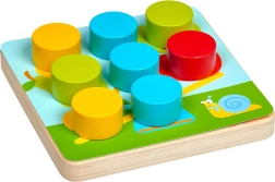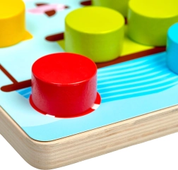 I grandi pioli in legno sono facili da afferrare e inserire nei fori, favorendo la coordinazione occhio–mano e l’apprendimento dei colori attraverso il gioco.