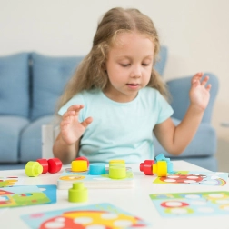 Questo mosaico educativo con grandi pioli è un’ideale proposta in stile Montessori per il primo allenamento delle dita e la coordinazione occhio–mano. I bambini inseriscono i pioli colorati nella tavoletta in legno seguendo le schede oppure creando motivi originali, esercitando così il ragionamento logico, la pazienza e la percezione visiva.