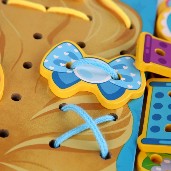 Il set di infilatura in legno Principessa offre un apprendimento giocoso e tanto divertimento creativo. Su una grande tavoletta con la principessa, i bambini possono creare le proprie acconciature e decorarle con corone, fiocchi e farfalline, fissandole con i lacci nei fori predisposti. L’attività favorisce pazienza, concentrazione e sviluppo della motricità fine.