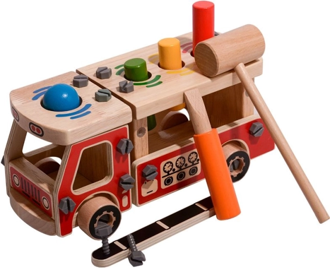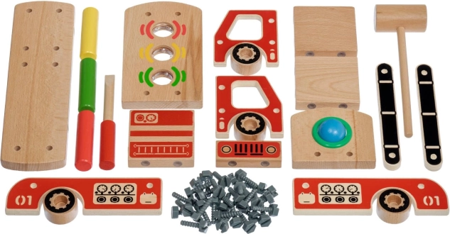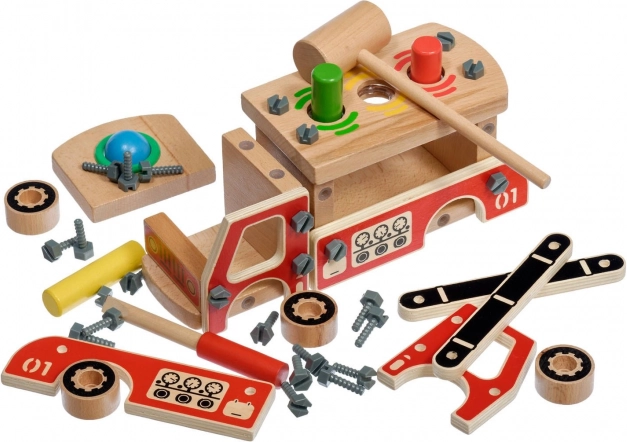 Assembla un camion dei pompieri in legno funzionante con viti e attrezzi. Il processo di costruzione favorisce il pensiero logico e la pazienza.