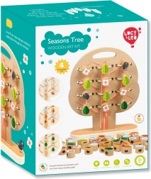 Grazie ai pezzi con motivi di foglie, fiori, frutti e fiocchi di neve, i bambini compongono l’albero in versione primaverile, estiva, autunnale e invernale e imparano colori e forme.