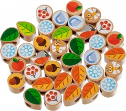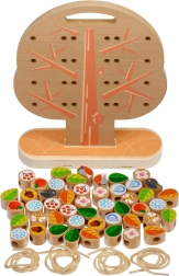 Questo set in legno di qualità offre ai bambini divertenti attività di infilatura e lacing su una robusta tavola ad albero con supporto. Il set include tessere colorate (foglie, fiori, bacche, ghiande, frutta, fiocchi di neve, insetti ecc.) e diversi lacci per infinite combinazioni. Dopo il gioco, i pezzi possono essere riposti nel pratico sacchetto di lino.