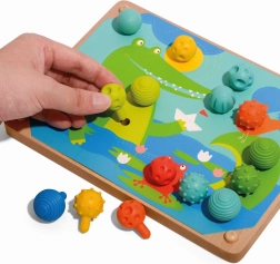 Questo set di gioco sviluppa la motricità fine e il pensiero creativo dei bambini grazie a 35 pioli in silicone con diverse texture e a schede colorate con animali.