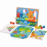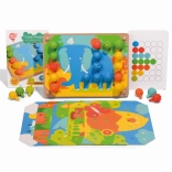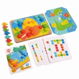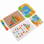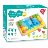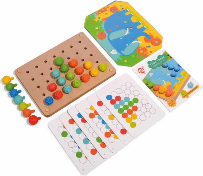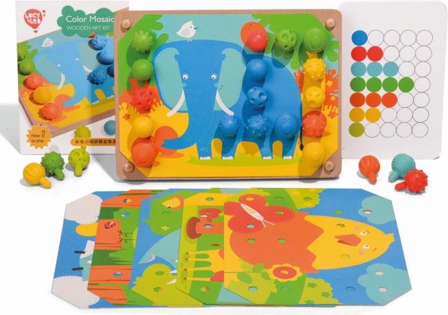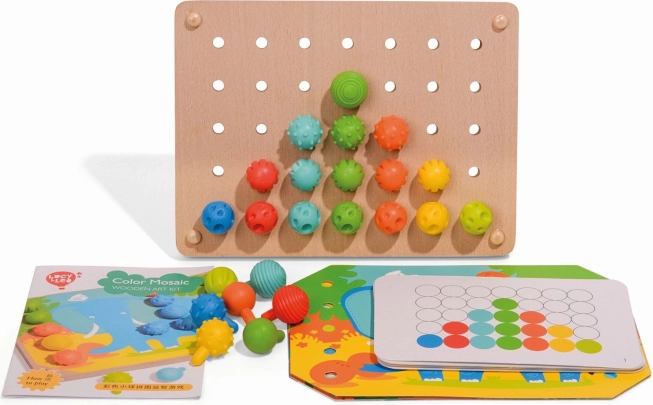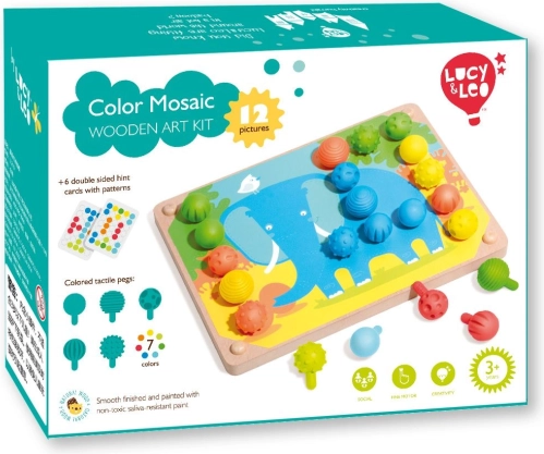 Il mosaico e ricamo è un ottimo strumento per i più piccoli per sviluppare le abilità di motricità fine e la creatività. Include 35 grandi pioli in silicone in sette colori vivaci, che i bambini possono utilizzare per completare le schede colorate. Il set comprende anche 12 immagini colorate con animali e 6 sagome bifacciali.
