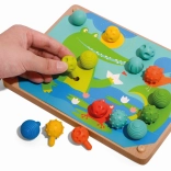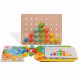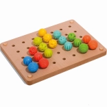 La base in legno con fori consente un facile posizionamento dei pioli, mentre i lacci colorati aggiungono un'ulteriore dimensione di gioco: la possibilità di ricamare. Le caratteristiche di questo giocattolo lo rendono un eccellente strumento educativo, utilizzato anche in contesti Montessori.