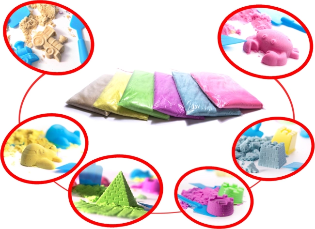 La materia plastica non si disperde e la sua consistenza ricorda al tocco un materiale estremamente piacevole e rilassante. La sabbia non perde le sue proprietà plastiche dopo il gioco, permettendo ai bambini di giocarci all'infinito.