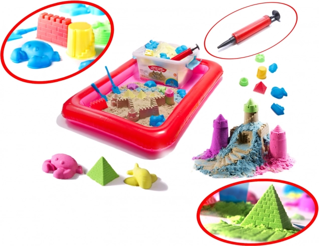 Il set di sabbia per bambini contiene 14 formine di plastica, rastrello, setaccio, spatola e imbuto. Con un tale equipaggiamento non vi annoierete. Il set con sabbia cinetica include anche una sabbiera gonfiabile che vi permette di mantenere l'ordine nel luogo di gioco.