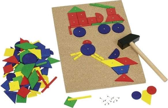 Scoprite un divertente gioco educativo che stimola fantasia e pazienza. I bambini dispongono le forme geometriche colorate sulla solida tavola in sughero e le fissano con un piccolo martelletto in legno e chiodini. Il set è ideale per i primi progetti di costruzione e per il gioco creativo.