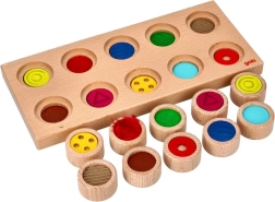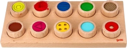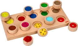 Scopri il divertimento sensoriale con il gioco in legno GOKI, che sviluppa la motricità fine, la percezione tattile e il riconoscimento di superfici e colori. I bambini cercano al tatto il foro giusto per ogni cilindro con texture diverse – senza guardare, in modo giocoso e sicuro.