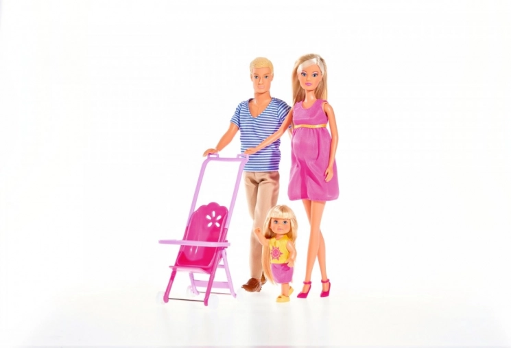 Il set Steffi Happy Family include 3 bambole: Steffi incinta, Kevin e la piccola Evi nel passeggino.Sono inclusi anche più di 19 accessori.