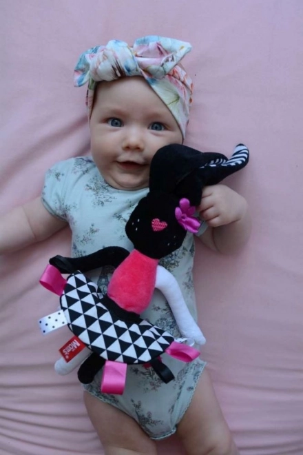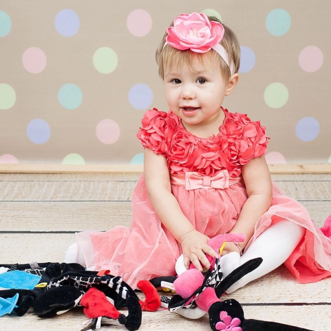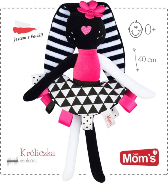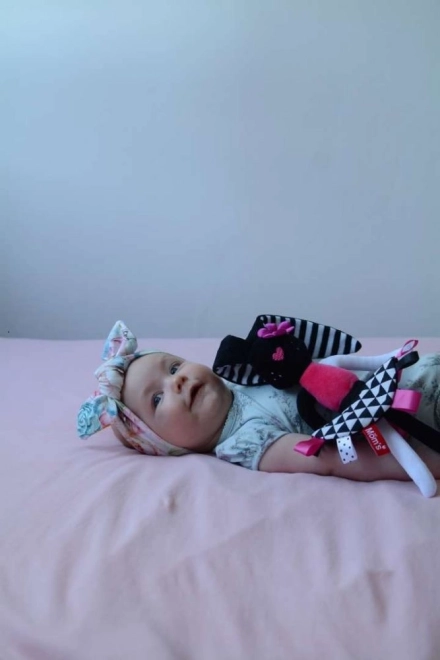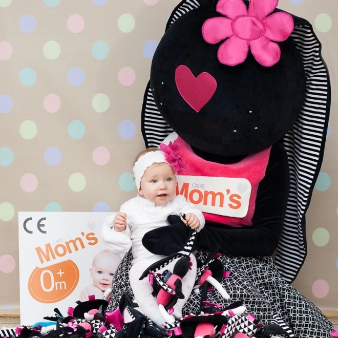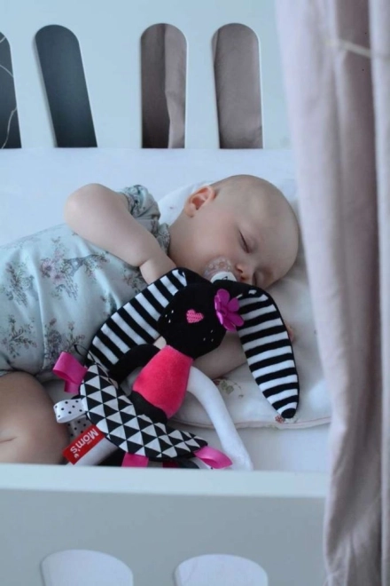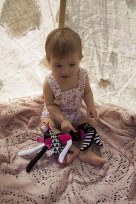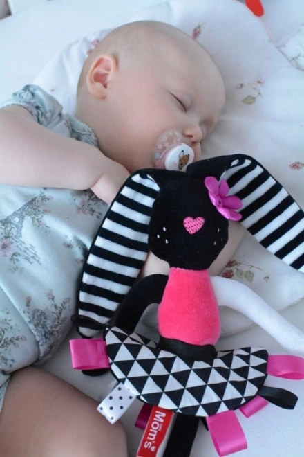 Questa coniglietta morbidissima è stata progettata per sostenere lo sviluppo sensoriale del neonato fin dai primi giorni. I contrasti marcati, il lieve fruscio nelle orecchie e nella gonnellina e le etichette colorate catturano naturalmente l’attenzione, rassicurano e aiutano a sviluppare la coordinazione occhio–mano. Le orecchie e gli arti lunghi sono facili da afferrare, così il bambino allena la presa e la motricità fine.