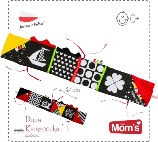 Il libricino sensoriale per neonati sostiene lo sviluppo naturale fin dalla nascita. I motivi ad alto contrasto aiutano a sviluppare la vista, i materiali morbidi e le superfici diverse (spugna, minky) stimolano il tatto e le parti fruscianti incoraggiano l’udito. Il libro può essere disposto lungo il lettino, creando un ambiente sicuro e stimolante.