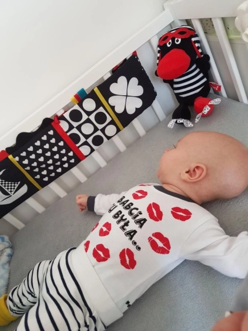 Scopri un intrattenimento delicato e stimolante per i più piccoli. Questo libricino sensoriale per lettino combina colori a contrasto (nero, bianco, rosso), diverse texture e elementi fruscianti per stimolare vista, tatto e udito. Grazie ai laccetti di fissaggio si aggancia facilmente al lettino o al passeggino, fungendo al contempo da morbida protezione antiurto. Realizzato con materiali sicuri certificati OEKO-TEX e conforme alla CE.