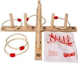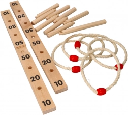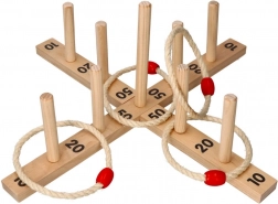Questo gioco include una base a croce con 9 pali in legno e cinque anelli in corda con elemento in legno per un facile lancio. Il gioco è realizzato in legno di qualità, assicurando divertimento duraturo.