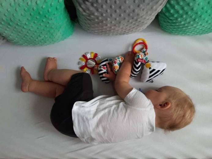 La spirale si avvolge in modo facile e sicuro attorno al maniglione del passeggino, seggiolino auto o culla, così è sempre a portata di mano – a casa e in viaggio. È realizzata con materiali sicuri, conforme alla norma EN-71 e prodotta in Polonia, a garanzia di qualità e cura nei dettagli.