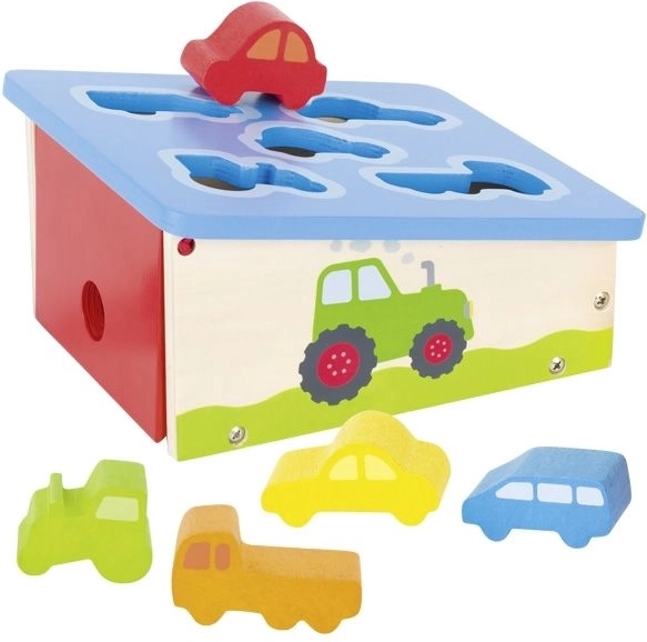 Scatola a incastri in legno con motivo veicoli che supporta la motricità fine, il pensiero logico e l'apprendimento di forme e colori. Legno massello, lavorazione sicura e design giocoso per i più piccoli.