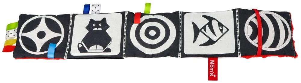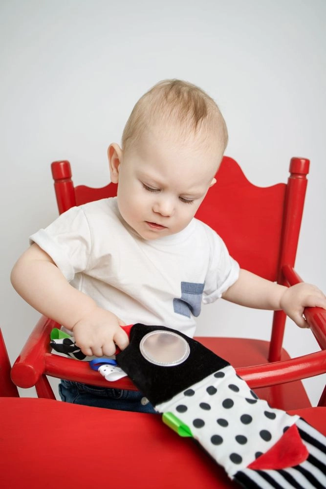 Motivi in bianco e nero con accenti rossi attirano l’attenzione dei neonati e aiutano a sviluppare l’acutezza visiva e il tracciamento degli oggetti.