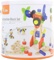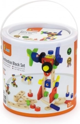 Questo set di costruzioni in legno universale offre ai bambini infinite possibilità di costruzione – da veicoli e animaletti fino a elicotteri o robot. Grazie ai solidi pezzi in legno, alle viti e ai connettori, i bambini allenano la coordinazione occhio–mano e imparano le basi del pensiero costruttivo.