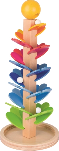 Questa spirale in legno di alta qualità del marchio GOKI ha la forma di una torre con foglie intagliate disposte a cascata in diversi colori. I bambini inseriscono la biglia nel foro in cima e osservano come rotola gradualmente verso il basso, producendo delicati suoni melodici. Il gioco è progettato per stimolare la motricità fine, il ragionamento logico e la pazienza.