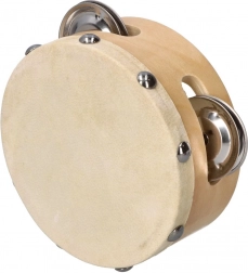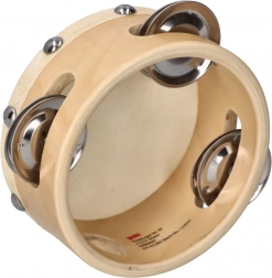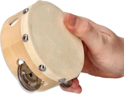 Il tamburino ha un aspetto tradizionale con corpo in legno naturale e piatti in metallo fissati saldamente.