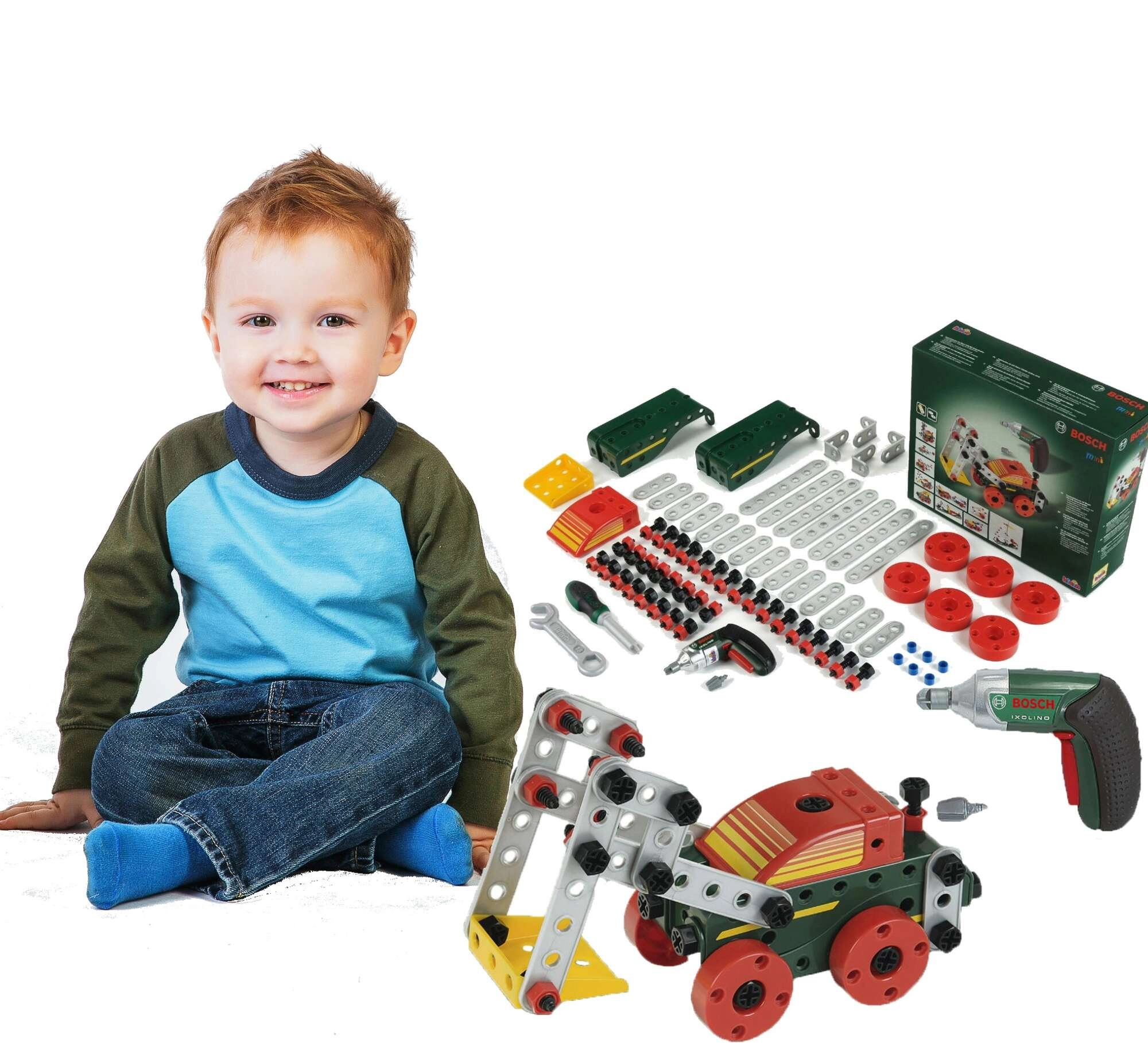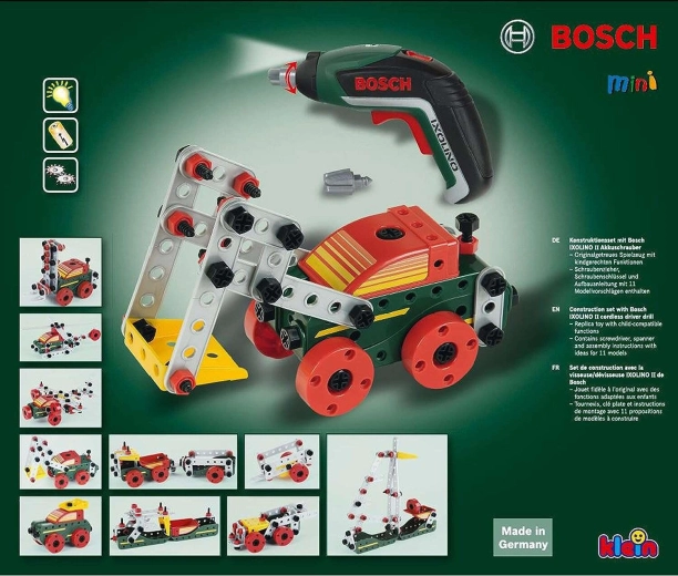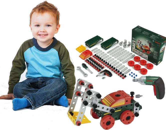 Questo set riccamente accessoriato combina costruzioni creative con un gioco realistico con veri utensili. I bambini possono, con l'aiuto dell'avvitatore per bambini BOSCH Ixolino, avvitare viti, collegare pezzi e costruire proprie strutture oppure seguire le istruzioni incluse per 11 modelli di veicoli.