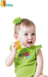 Alcuni cubetti contengono campanellini e sonagli: muovendoli, il bambino scopre toni e ritmi diversi, sviluppando in modo naturale l’udito.
