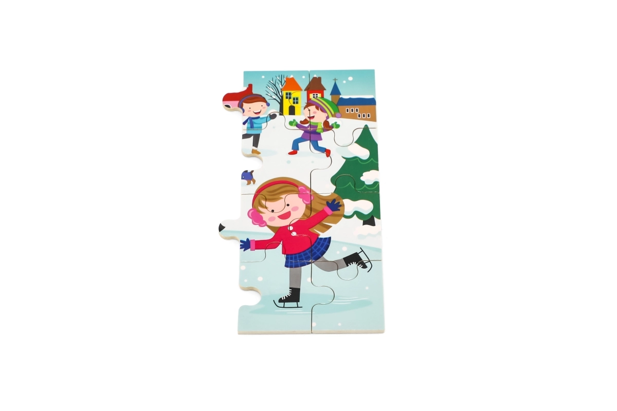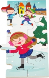 Una colorata scena invernale con bambini sulla neve motiva a comporre il puzzle e sviluppa la percezione dei colori, dei dettagli e delle situazioni.