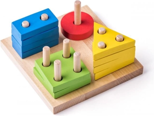 Il set include cerchi, rettangoli, triangoli e quadrati dai colori vivaci, che i bambini riconoscono facilmente e posizionano correttamente sui pioli.